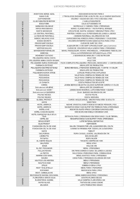- 5 premios para ESO: 1.-WAKE, PADDLESURF, KAYAK, HINCHABLES para 2 PERSONAS, 2.- CAMPAMENTOS NAUTICOS EN INGLES en BEACH ESCOLAS BAO PAR 2 PAX 1 SEMANA, 3.- DESCENSO EN KAYAK PARA 4 POR EL RIO, 4.-30 MINUTOS EXPERIENCIAS VIRTUALES HASTA 2 PAX, 5.- PARTIDA BOLERA PARA 4 PAX